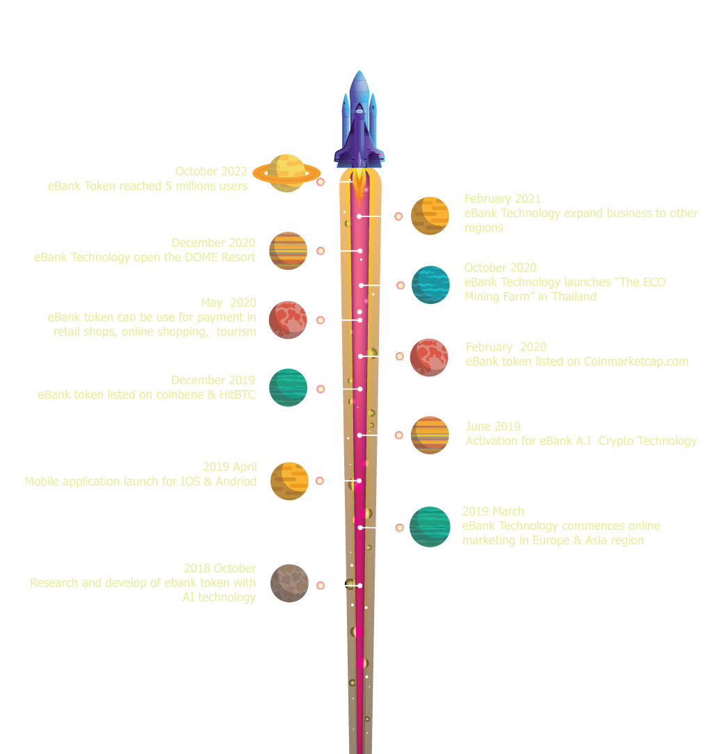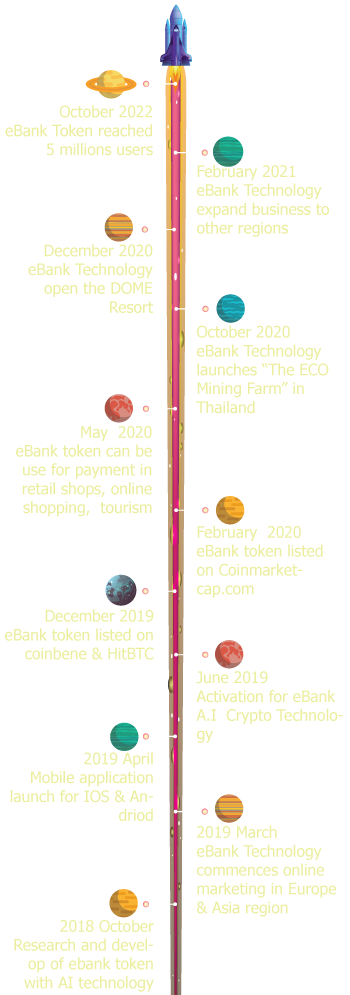 EBT crypto currency is the original token in the eBank Token system with a total of 21 million token. eBank Token is generated based on the ERC20 contract. EBT is used to perform various operations on eBank wallet. EBT is an intermediary to exchange between different coins as well as to convert profit from AI-Crypto. EBT currency serves merchants who support the eBank Token system. The platform shall launch a smart blockchain-based POS machine for global merchants’ use!